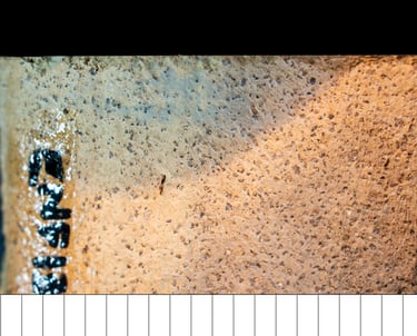 Abundant v fine sand, generally well-sorted, moderate clay pellets/large clay lenses, generally self-coloured in a buff, grey or black matrix.
