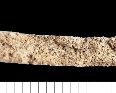 Abundant well-sorted sub-rounded silt with sparse fine ill-sorted sub-angular sand (clear), sparse ferrous oxide, rare chalk, and sparse to common mica. Fine dark greyware, may have a yellowish or brown core, similar to NNFSW.