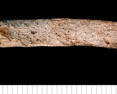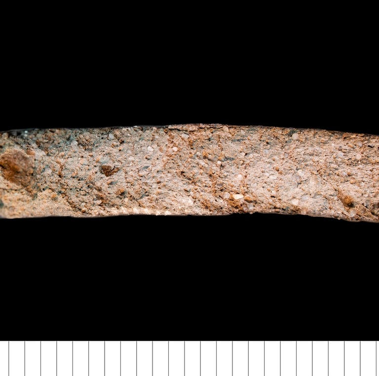 Thin-section description (H. Page): Poorly sorted, very coarse to fine sand sized, equant rounded to sub-rounded quartz inclusions, and fewer polycrystalline quartz inclusions, with sparse fine biotite mica, rare microcline feldspar, weathered feldspar, muscovite mica, and ferruginous opaque minerals. Additionally, very rare lithic inclusions of micaceous sandstone and chert. Optically inactive, dark brown-black, reduced, non-calcareous matrix. Rare meso- to micro- parallel sided voids and a shrinkage void around the single piece of grog.