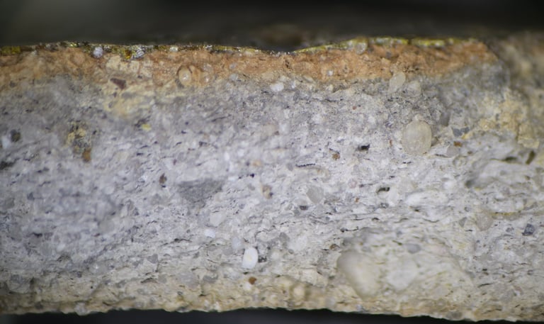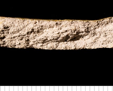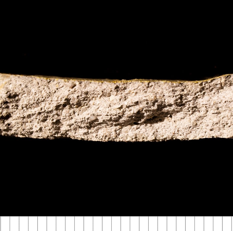 TS sample description (Patrick Quinn): Fine and medium-sand sized rounded to sub-rounded inclusions of quartz with less common polycrystalline quartz, chert, quartzite and microcline. Possibly added as temper due to grain size gap between sand and more angular intrinsic quartz and rare muscovite mica inclusions. Several large natural silty clay features. Non-vitrified, non-calcareous reduction fired clay matrix. Frequent meso- and macro-elongate voids.
