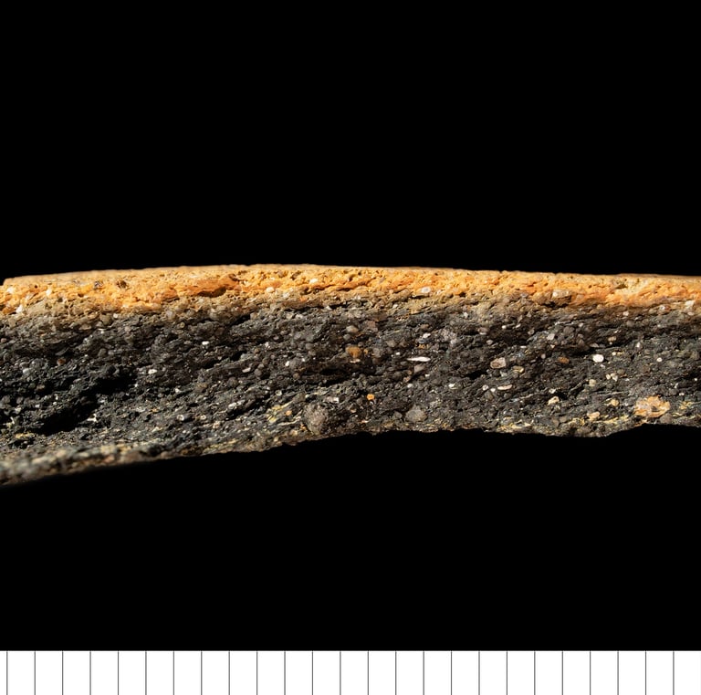 Chalk-tempered sandy wares, generally black cores and oxidised surfaces. See Spoerry 2008 & 2016