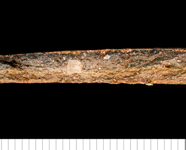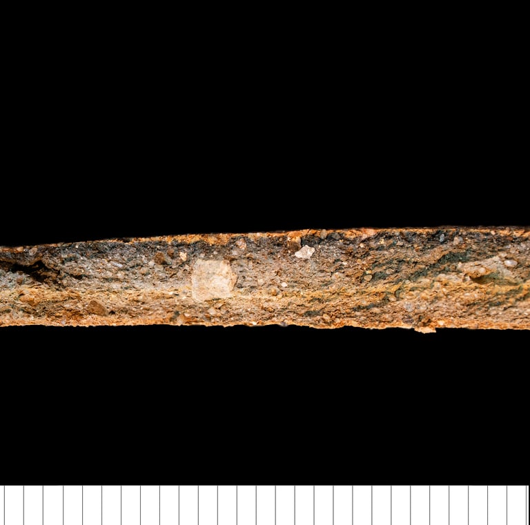 TS description (H. Page): Moderately sorted, sub-angular to sub-rounded, coarse to fine sand sized quartz and polycrystalline quartz. Common elongate biotite mica, few fine inclusions of muscovite mica, small, rounded chert and iron-stained chert, ferruginous opaque minerals, and rare microcline and plagioclase feldspar. Homogeneous, non-calcareous deep red to dark brown-black matrix, with rare iron rich discordant textual features with a high optical density. Highly optically active matrix at the outer section edge and inactive unoxidised at the inner part of the vessel. Frequent elongate meso- and macro- channels and vughs.