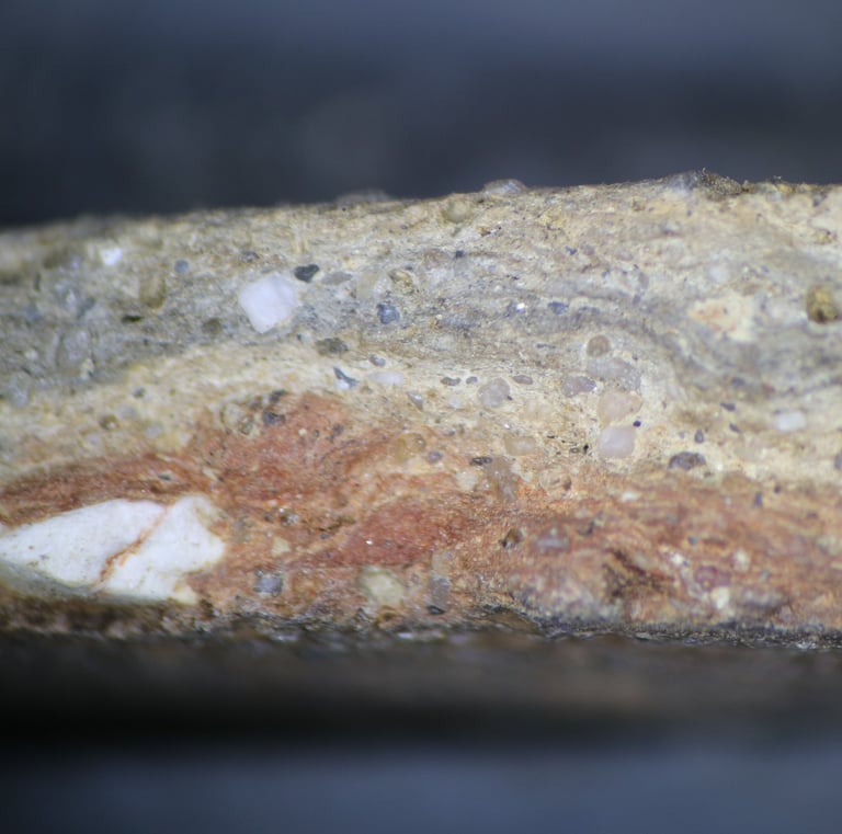 Microscope view. Fine-medium sandy (white, grey, clear, cream, brown), sparse coarser quartz, sparse coarse flint, sparse ferrous oxide, sparse mica.