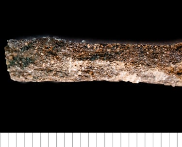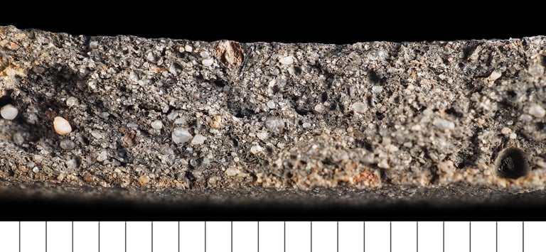 TS description (H. Page): Well sorted, common generally equant, rounded to sub-rounded, very coarse to fine quartz and rare microcrystalline quartz. Very fine few biotite mica inclusions and ferruginous opaque minerals, and rare microcline and weathered feldspar. Non-calcareous, yelloworange-brown to dark red-brown, homogeneous highly optically active and oxidised matrix. Common discordant, deep red, iron-rich textual features with high optical density. Common macro- and fewer meso-vugh and channels. Possibly sand tempered.