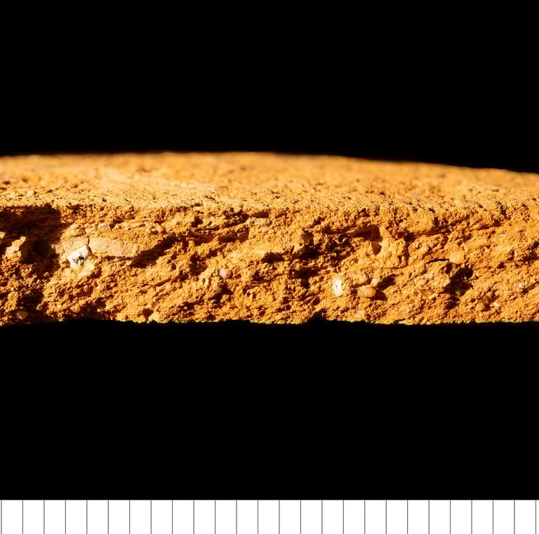 Fine silty matrix with dispersed medium to coarse or very coarse quartz and flint. The individual grains are visible on the outer surface. Occasional iron mineral or other inclusions. Little or no mica present. (Thompson 2018)