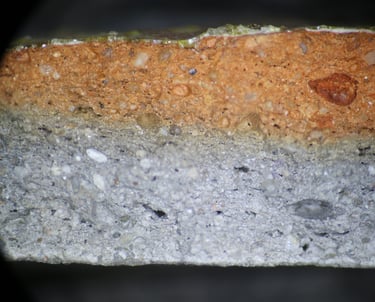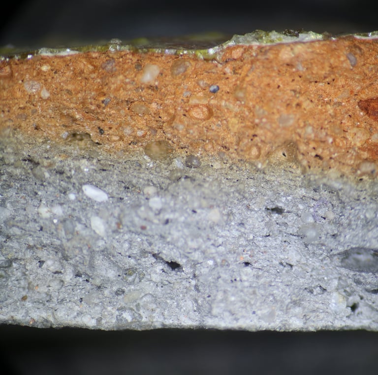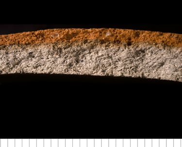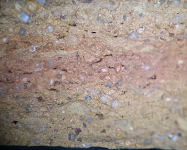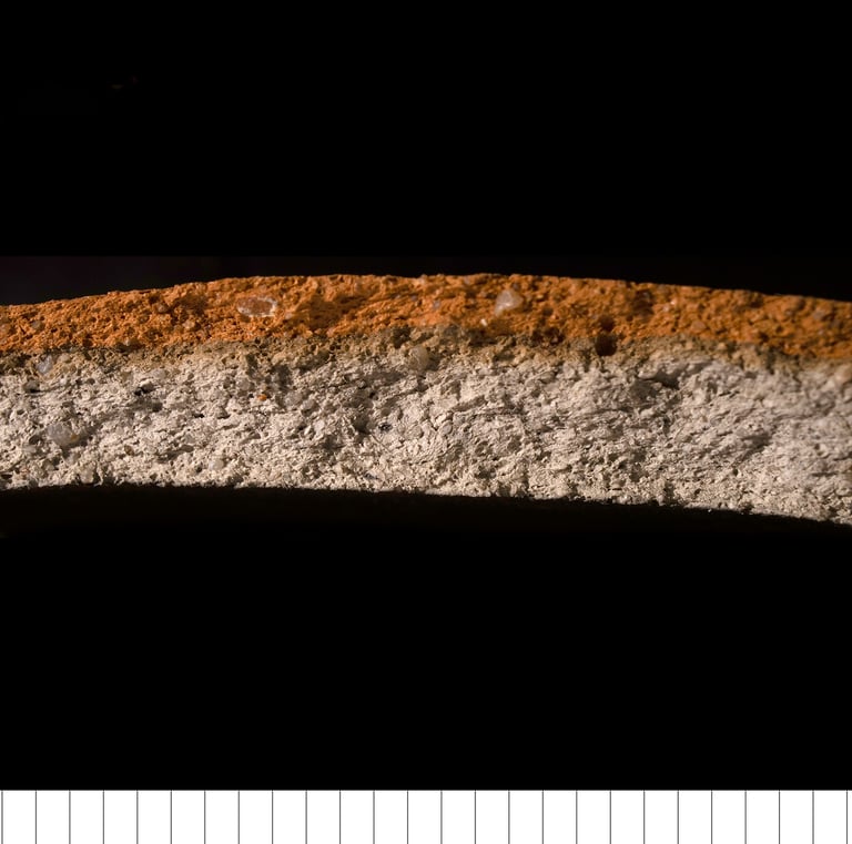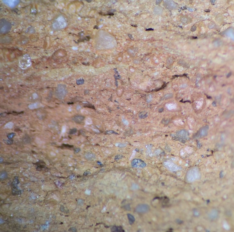 TS sample description (Patrick Quinn): Moderately well-sorted fine sand and silt sized sub-rounded to angular inclusions of quartz with less frequent polycrystalline quartz, chert and rare glauconite. The more angular silt-sized inclusions contain frequent muscovite mica and ferruginous material. Non-vitrified non-calcareous clay matrix that is oxidised on one half and reduced on the other. Frequent meso-elongate drying voids and one elongate macro-void with charred plant matter.