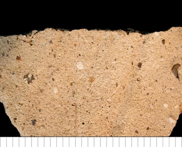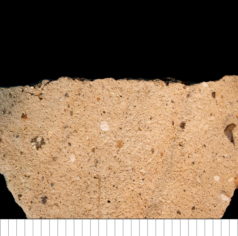 TS description (H. Page): Poorly-sorted, very coarse to very fine, rounded to sub-rounded quartz and polycrystalline quartz. Rare plagioclase feldspar, frequent very fine to fine elongate biotite mica, and rock inclusions of micaceous sandstone. Brown, oxidised, heterogeneous, non-calcareous clay matrix with high optical activity. Some rare darker brown streaks and rare discordant dehydrated clay inclusions with high optical density and concordant textual features with neutral optical density. Few mega- and meso-channels which are parallel to the vessel wall. Possibly sand tempered.