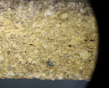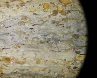 Fine to medium, fairly soft fabric with abundant fine sand (including 'sparkly', high proportion stained yellow), sparse to moderate mica, occasional large self-coloured clay lenses and occasional ‘local’ inclusions such as chalk and ferrous fragments. Usually pale grey but may be oxidised to a buff or orange.