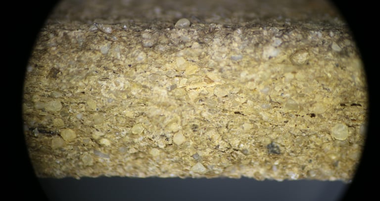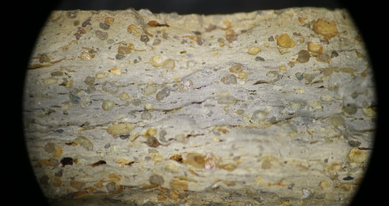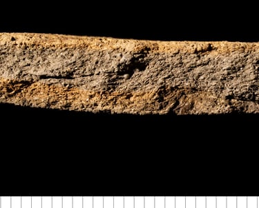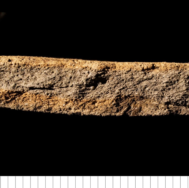 TS sample description (Patrick Quinn): Well-sorted medium sand to silt-sized sub-rounded to sub-angular inclusions of quartz, polycrystalline quartz, chert, calcareous grains, plagioclase, ferruginous inclusions and rare mica. The rare calcareous inclusions are composed of micritic calcite and foraminifera microfossils. Non-vitrified clay matrix that is oxidised on one margin. Matrix contains distinct variegation including more iron-rich non-calcareous areas and calcareous lighter coloured bands and streaks than could indicate intentional mixing or could be natural and poorly blended. Sparse meso- and macro-elongate voids.