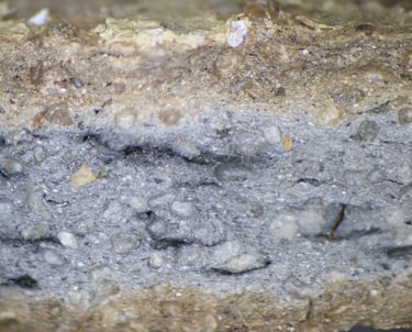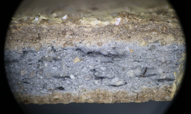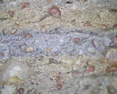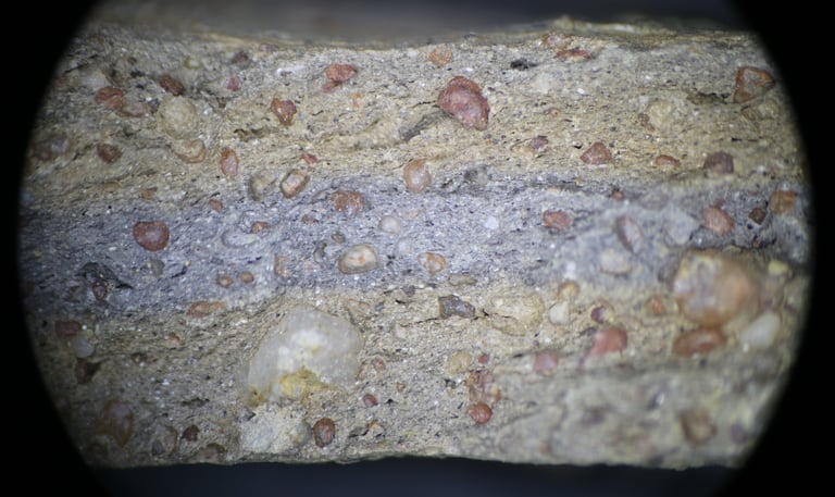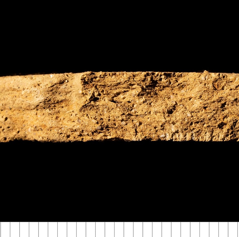 TS sample description (Patrick Quinn): Relatively sparse sand-sized sub-angular inclusions of quartz, polycrystalline quartz, chert, bone and pottery fragments. The latter are rare, but positively identified and may represent temper. Non-vitrified, non-calcareous mottled, oxidised clay matrix. Rare large vugh-shaped voids. Mica is not present except in trace amounts in the silt-sized fraction.